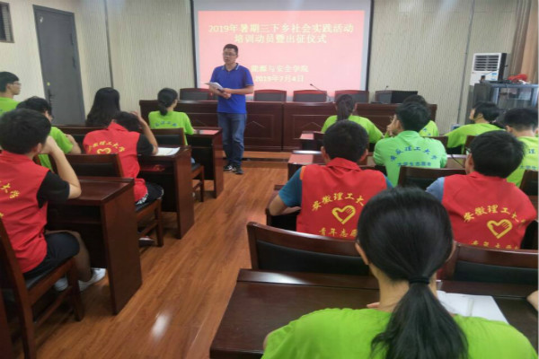 7月4日下午,能源与英国正版365官方网站在宁远楼A410报告厅举行2019年大学生暑期“三下乡”社会实践队员培训暨出征仪式。各年级辅导员和60余名大学生志愿者参加。
