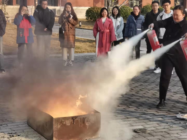 培训中,彭广峰通过图片、PPT等课件向在场的师生们通报了几起重大火灾事故案例,分析了起火原因并详细介绍了火场逃生、初起火灾扑救知识以及灭火器材的正确使用方法。随后,彭广峰带领师生们在学院楼前的空地举行了灭火器的实战演练,并就火灾的类型合理选择灭火器进行了现场讲解。师生们一边观摩,一边学习。最后,在彭广峰的指导下,部分师生亲身体验了现场灭火过程,熟练并正确地使用灭火器将燃起的大火迅速扑灭。