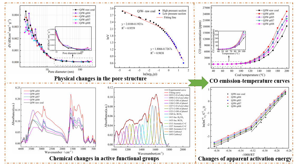 第一篇题为Erosion effect on microstructure change and oxidation behavior of long-flame coal under different pH conditions,为袁树杰教授和2019级博士郭胜利共同完成。该论文研究了不同酸碱条件下浸蚀煤的微观物理化学结构变化及其低温氧化特性,揭示了浸蚀煤氧化活性增强的机制,并得到不同酸碱条件的浸蚀过程会增加煤的自燃风险的结论。该研究成果能够为预测浸蚀煤的自燃倾向性、预防煤炭自燃提供理论基础。该研究工作得到安徽理工大学研究生创新基金项目的支持。