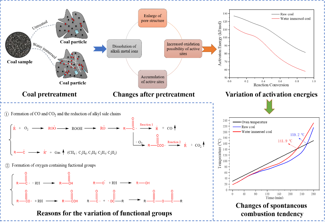 第二篇题为Oxidative kinetic characteristics of dried soaked coal and its related spontaneous combustion mechanism,为陆伟教授和李金虎老师共同完成。该论文运用煤中活性位点的常温氧化观点揭示了长时间水浸后煤体自燃危险性明显增加的内在原因,发现水浸过程明显增加煤中活性中心的浓度,能够为煤的氧化提供了物理通道,导致水浸煤放水后快速氧化。该研究成果为有效抑制水浸煤体自燃提供了新思路。该研究工作得到了“博士后创新人才支持计划”的支持。