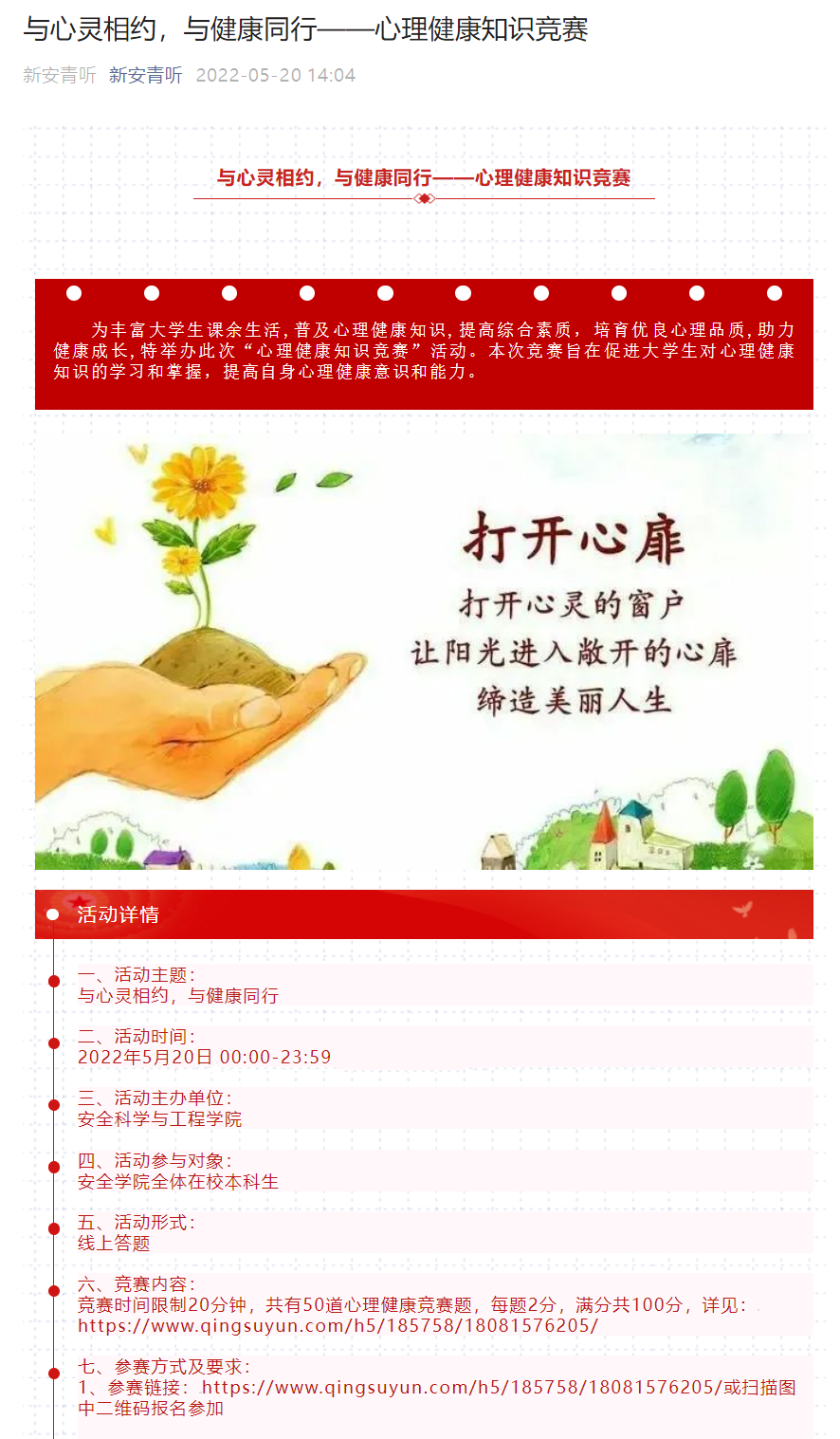 5月20日,学院在“新安青听”公众号上举办线上心理健康知识竞赛。通过竞赛帮助同学们学习掌握心理健康知识,提高了同学们自身心理健康意识和能力。竞赛评选出一等奖5名、二等奖10名、三等奖20名。