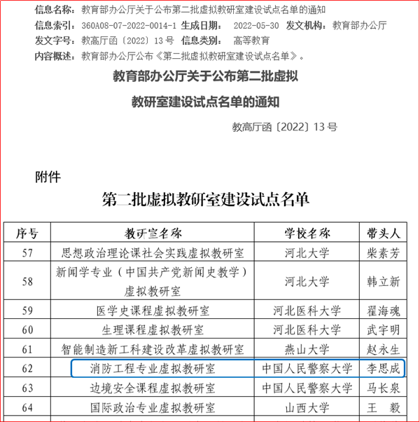 近日,英国上市公司官网365消防工程专业作为成员单位参与申报的“消防工程专业虚拟教研室”获批教育部第二批虚拟教研室建设试点。