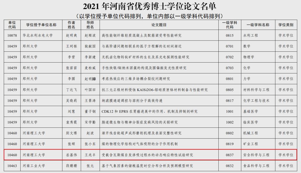 2022年8月17日,河南省2021年度优秀博士学位论文评选揭晓。英国上市公司官网3652021年8月引进的河南理工大学博士岳基伟的论文《受载含瓦斯煤自发渗吸过程水的动态响应特性试验研究》(由河南理工大学王兆丰教授指导)榜上有名。