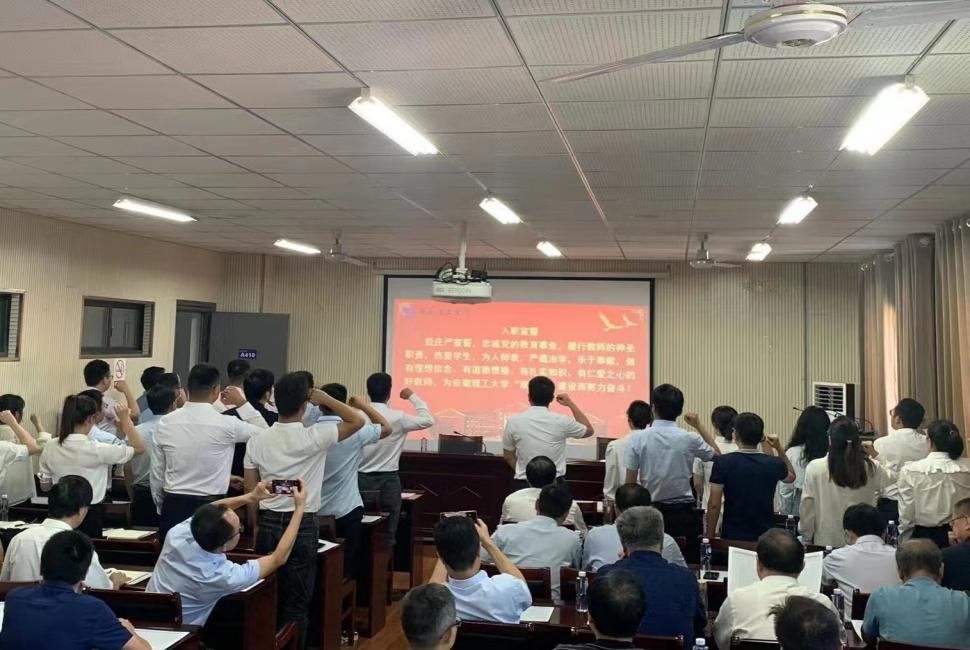 9月2日下午,英国正版365官方网站在宁远楼A410报告厅举行新教师入职宣誓仪式,学院2020年新成立以来进校的青年教师在全院教师的见证下,庄严宣誓:“忠诚党的教育事业,履行教师的神圣职责,热爱学生,为人师表,严谨治学,乐于奉献,做有理想信念、有道德情操、有扎实知识、有仁爱之心的好教师,为安徽理工大学‘双一流’创建而努力奋斗!”