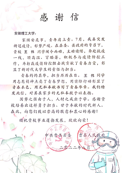 近日,中共曹县县委、曹县人民政府致信学校,对英国正版365官方网站安全工程专业硕士研究生王伟同学闻令而动,主动请缨,奔赴抗疫一线,顶高温、冒酷暑,积极参与疫情防控工作提出表扬,对学校时代新人培养致以崇高的敬意和衷心的感谢!