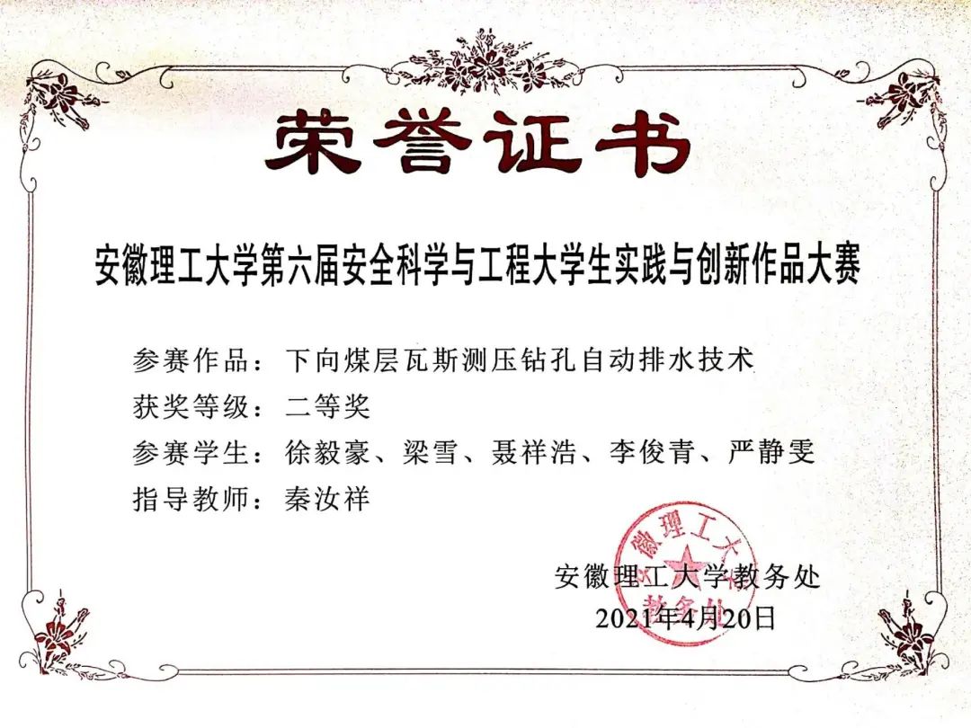 本科期间连续两年获校一等奖学金,三次获得三好学生,一次三好学生标兵,优秀学生干部。作为第一作者在北大中文核心期刊发表学术论文一篇,主持一项国家级、两项省级大学生创新创业训练计划项目,主持一项大学生创业基金扶持项目、以及2022年大学生创业基金追加扶持项目(全校仅两件获批),徐毅豪在校期间带队自主研制煤层瓦斯测压下向钻孔自动排水装置;拥有一项实用新型专利(一种超细水雾影响可燃气体爆炸特性实验装置)和一项软件著作(钻孔瓦斯压力、水位智能在线监测系统)。