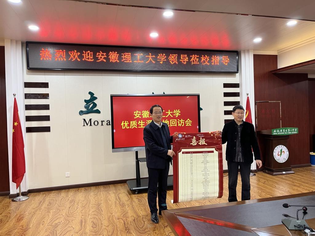 2022年11月24日上午,学院党委书记金德、副书记曹宣明、副院长刘健等一行4人赴寿县一中开展优质生源基地回访工作,与寿县一中副校长赵士兵、朱绍琴、张家献及教导处、高三年级组负责人等进行了交流座谈,并赠送喜报。