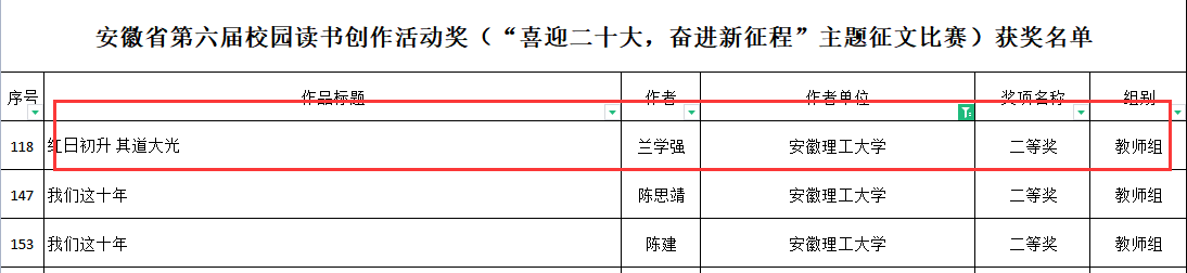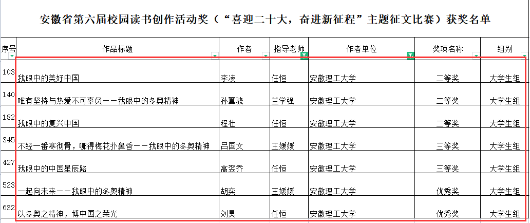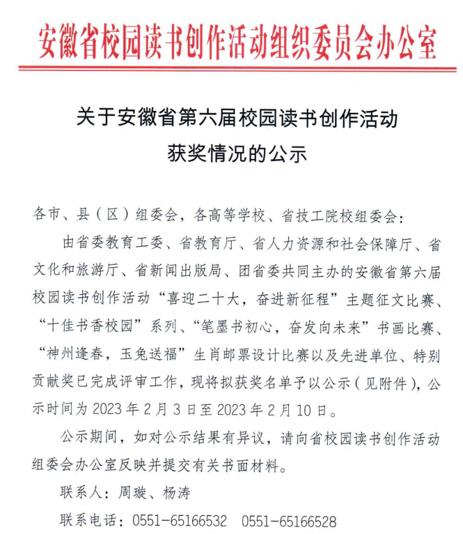 近日,由安徽省委教育工委、省教育厅、省人力资源和社会保障厅、省文化和旅游厅、省新闻出版局、团省委共同主办的安徽省第六届校园读书创作活动评审结果揭晓,英国上市公司官网365累计获奖9项。其中,二等奖5项,三等奖2项,优秀奖2项。