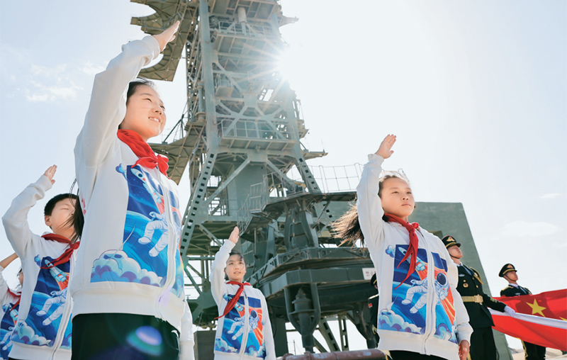 少先队是建设社会主义和共产主义的预备队。广大少先队员在少先队这所大学校里立志向、修品行、练本领,从小培养热爱党、热爱祖国、热爱人民的情怀,展现出朝气蓬勃的精神风貌。2024年4月24日是第九个“中国航天日”,“红领巾爱祖国——我心中的五星红旗”主题活动在中国酒泉卫星发射中心东方红卫星发射场举行。图为当日,来自内蒙古、甘肃、四川等地的少先队员在中国酒泉卫星发射中心东方红卫星发射塔架下敬队礼。新华社记者 金立旺/摄