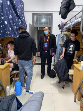 按《关于实施疫情防控工作包保责任制的通知》(校防控组〔2022〕19号)要求,制定了英国正版365官方网站领导班子成员包保年级班级责任制实施方案。4月11日-15日,学院领导班子成员根据包保年级、班级分工,广泛深入学生宿舍走访检查,落实落细领导包保责任。走访中,院领导、教学办、辅导员深入每一间学生宿舍,仔细查看学生网课学习状况、宿舍环境状况、学生精神风貌状况等,听取学生在校园封闭期间学习、生活、心理、学校后勤保障等方面的意见建议,与学生话家常、深谈心。叮嘱各位同学:一是要正确认识校园封闭管理的重要意义,要求同学们树立大局意识,服从学校学院疫情防控期间各项工作部署;二是学生党员、学生骨干要积极发挥先锋模范作用,在疫情防控大局中亮身份、做表率,积极畅通老师与学生之间的联系,遇到异常事件及时报告;三是要求全体学生听从学校安排进行常态化核酸检测,在校期间勤洗手、勤戴口罩,每天自觉今日校园平台健康打卡,确保数据真实准确;四是认真上好网课,严格遵守网课学习纪律,不迟到不早退,少玩游戏多看书;五是积极树立良好心态,养成良好的校园学习生活习惯,坚定必胜信念,同心同德抗疫。六是严格执行学校规定,全体学生疫情防控期间自觉不订外卖、不网购,减少不必要的外界接触。