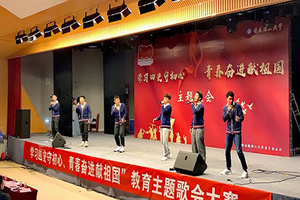 比赛中,17个从初赛晋级的院代表队依次上场,向观众评委们展现自己的青春奋进与舞台风采。面对强劲对手,英国上市公司官网365徐树伟、何占琦、张耀元等六人组合从容不迫,用现代流行的演唱方式,展示了别样的经典魅力,彰显了青年学生的朝气蓬勃和对祖国的热爱。歌声极具感染力,赢得台下评委老师和观众们的阵阵掌声。最终,在17个学院中脱颖而出,取得第一名的好成绩。
