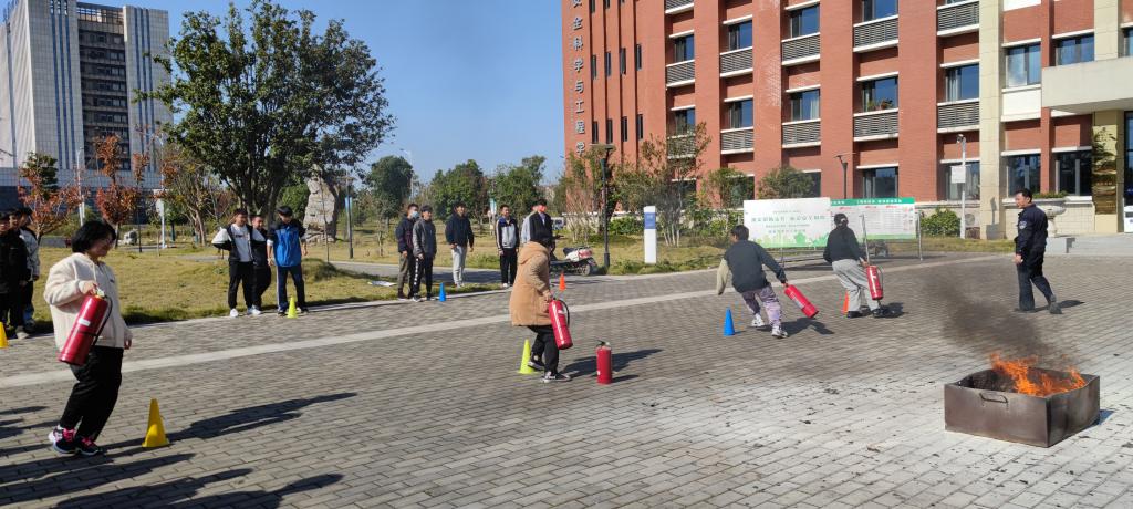 消防趣味竞技,消防教育更活泼。11月13日上午10点,随着火灾警报响起,工作人员按照演练方案引导学生快速疏散,学生按照要求弯腰屈身,用毛巾、衣、袖口等掩住口鼻,有序、迅速地撤离到安全地点,并清点人数。保卫处彭广峰向学生讲解了灭火器的操作方法,现场示范了干粉灭火器的使用操作。随后,学生分组进行趣味绕桩接力,由最后一位同学扑灭油槽。整个过程,既让学生掌握灭火器等消防器材的操作要领,又增强了学生的团队意识。