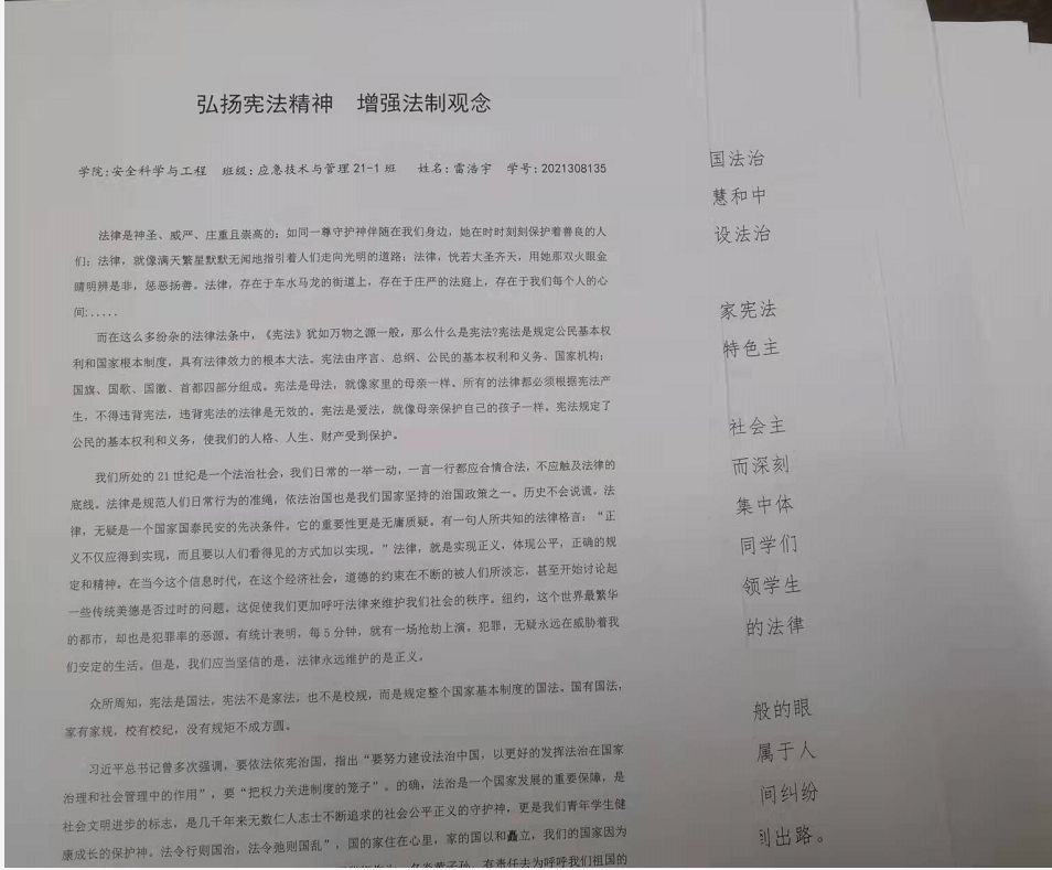 举办征文比赛,弘扬宪法精神。12月1日,学院举办宪法日主题征文比赛。本次比赛涌现出大量优秀作品,同学们直抒胸臆,字里行间分享着自己与宪法的故事、对祖国法治建设的展望等。经评选,张玮民同学获得一等奖,王清、胡莹同学获得二等奖,张傲、雷浩宇、陈楷同学获得三等奖。
