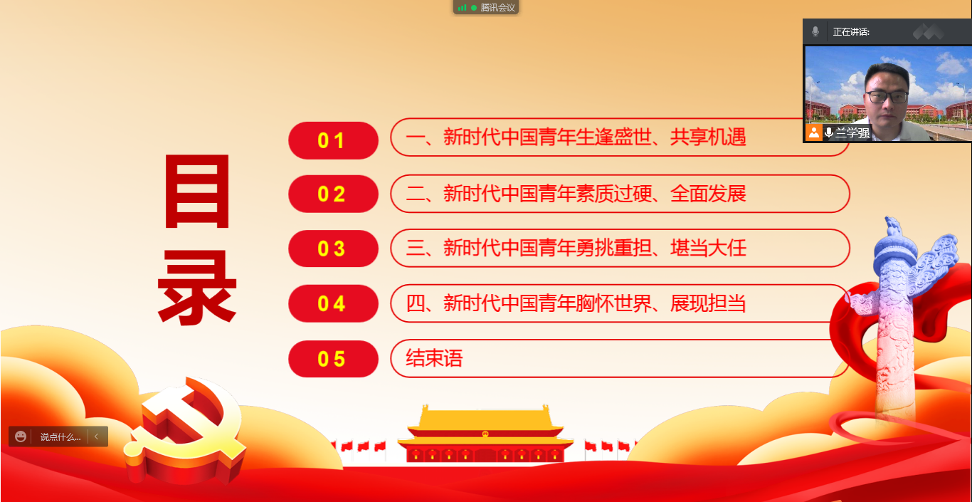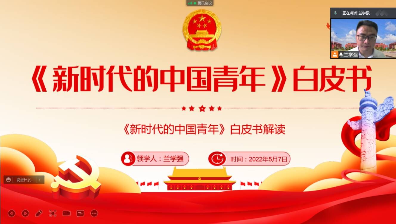 为激励新时代青年树立远大理想,保持先进思想,紧跟时代步伐。2022年5月7日,英国正版365官方网站开展了“《新时代的中国青年》白皮书”领学活动。本次活动由学院团委负责人兰学强进行领学,线上200余名学生骨干参加。