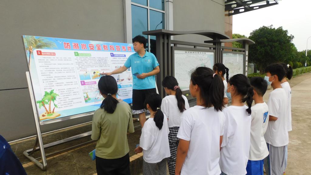 7月5日上午,实践团的志愿者走访入户进行发放宣传单,宣传防溺水、防电诈安全知识,主动构筑起家庭及留守儿童的生命安全坚实防线。并联合赛涧回族乡中心学校前往姜唐湖退水闸管理处开展现场防溺水宣传教育。为增强宣传效果,现场还布置了宣传展板和宣传条幅,并为大家发放了宣传袋、宣传手册。