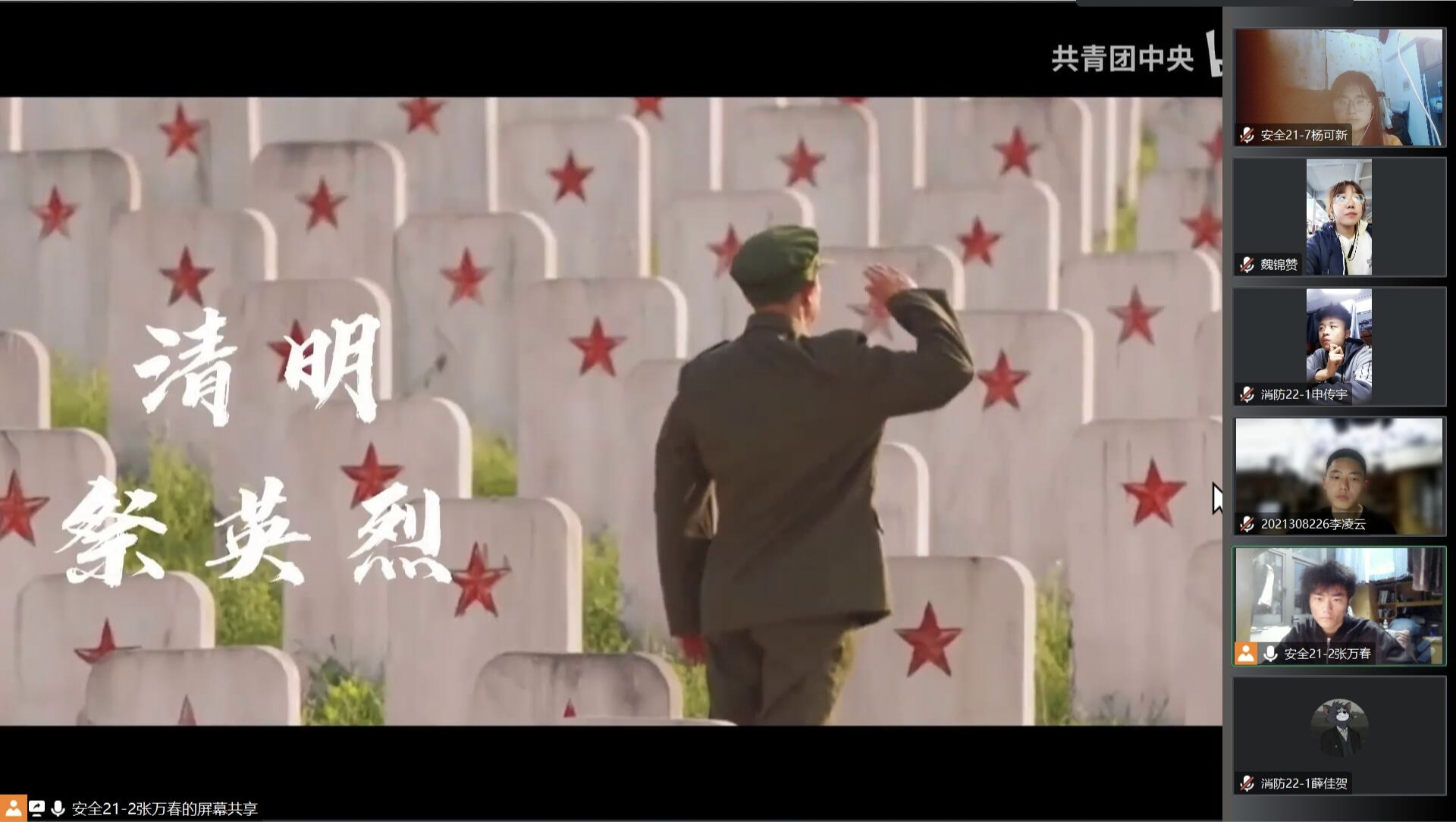 4月4日,为激励安全学子把爱国之情转化为强国之志、报国之行,传承弘扬英烈事迹和精神,学院组织同学们线上开展祭英烈活动。同学们怀着敬仰之心向鞠躬尽瘁的先烈致敬,在庄严肃穆的悲颂中点烛、献花和默哀。以此表达对英烈的崇敬之心、感念之情、传承之志。