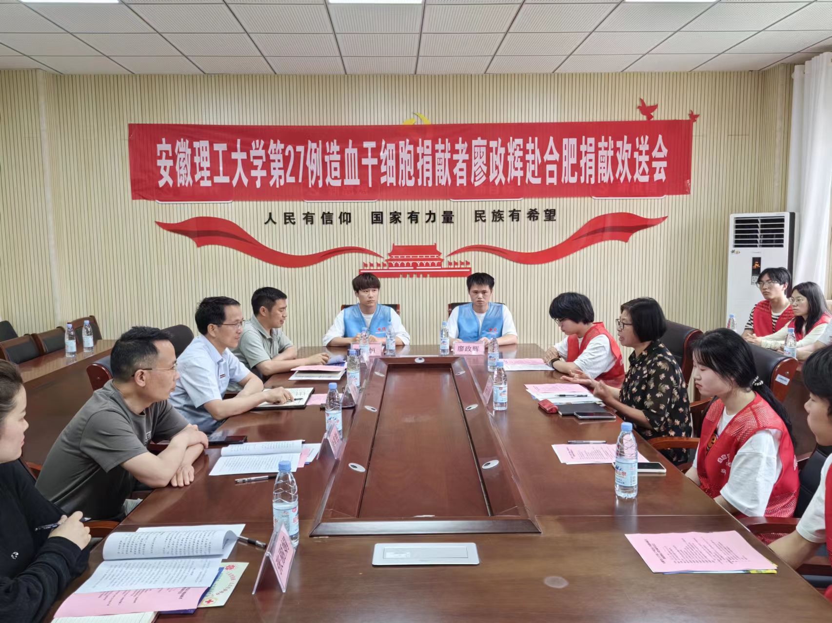 5月21日下午,英国正版365官方网站在宁远楼A306会议室举行造血干细胞捐献者廖政辉同学赴合肥捐献欢送仪式。淮南市红十字会常务副会长兼秘书长陈玉琴,英国正版365官方网站党委书记金德,校学生处处长、校团委等部门负责人,学院辅导员、淮南市造血干细胞已捐献者代表、志愿者代表、班级学生代表、国寿财险公司负责人出席欢送仪式。仪式由学院分管学生工作负责人主持。