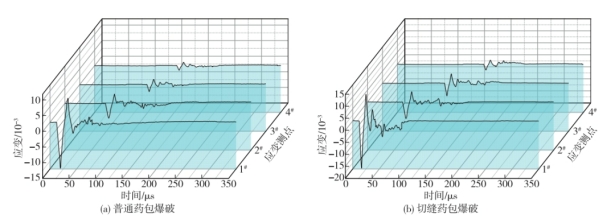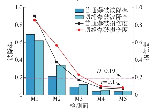 (2)使用损伤度D和波降率η对岩石损伤程度进行定量描述。分析表明,普通药包在爆炸近区造成的岩石损伤程度大于切缝药包,而随着爆心距增大,普通药包爆破能量迅速衰减,到达M3检测面的能量已经不足以对岩石造成破坏。相比而言,切缝药包能量衰减缓慢,对岩石损伤范围更大。