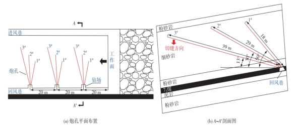 随着煤矿开采深度的增加,矿压问题凸显,同时面临高矿压、高瓦斯的矿井逐渐增多。然而现阶段对矿压和瓦斯治理方面的研究通常是割裂开来的。在面对厚硬顶板悬顶和上隅角瓦斯超限的实际工程问题时,探索一种兼顾瓦斯与矿压治理的新方法对于煤矿安全生产具有重要意义。鉴于此,研究团队提出了使用切缝药包超前预裂爆破技术对厚硬顶板进行弱化的方法结合高位瓦斯抽采钻孔同时解决矿压和瓦斯问题。与普通药包爆破相比,该方法的特点在于,在不增加炮孔数量及单孔装药量的前提下定向扩大爆破致裂范围,从而保障巷道安全、改善顶板冒落性、提高高位瓦斯抽采钻孔利用率、节约经济成本。本文以淮北煤电集团任楼煤矿ⅡN7224N工作面为工程背景,在实验室内开展普通药包与切缝药包超前预裂爆破对比试验,探索切缝药包爆炸荷载作用下厚硬顶板应力应变演化规律、岩层损伤分布特征。基于试验结果,计算工程现场中切缝药包的致裂范围,并对切缝药包超前预裂爆破顶板的炮孔布置参数进行了设计,评估其经济效益。