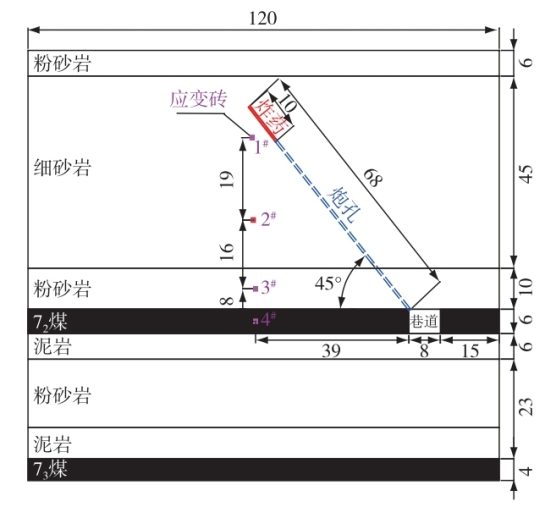 (4)提出了一种基于相似模拟试验结果的爆破弱化硬岩范围的计算方法,计算可知工程现场中普通药包爆破的岩石弱化半径为16.5m,切缝药包爆破弱化岩石半径为21.8m,是普通药包爆破的1.32倍。使用切缝药包进行厚硬顶板预裂爆破可以有效增加岩石破裂范围,改善高位瓦斯钻孔抽采效果,与普通药包爆破施工成本相比具备一定的经济效益。