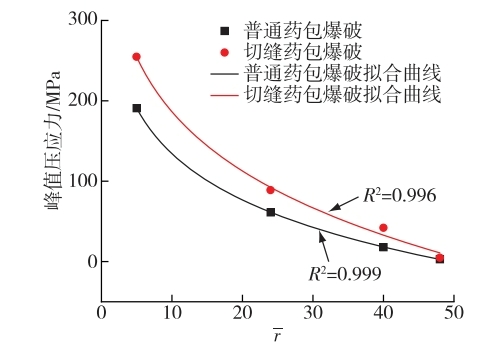 (3)在爆破近区,切缝药包在切缝方向上的爆炸波速度比普通爆破更快,测点的峰值应变与峰值应力也更大,表明切缝方向上的岩石会受到更强的爆炸动载。峰值应力拟合结果表明,峰值应力随