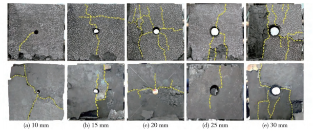 (2)根据声发射累计事件数和能量变化,试样破坏过程可分为:裂纹萌生、裂纹稳定扩展、裂纹非稳定扩展和裂纹贯通等4个阶段。声发射信号在裂纹萌生阶段开始活跃,在裂纹稳定扩展阶段持续活跃,在裂纹非稳定扩展阶段急剧增加并达到能量峰值,在裂纹贯通阶段明显减弱。试样破坏过程中声发射峰值能量随孔径增大而增大。