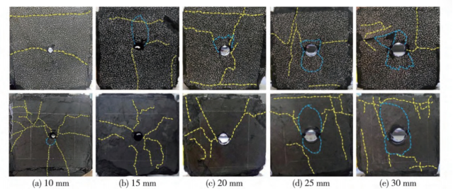 (3)应变场演化过程与实际拱形裂纹及塌陷区形成过程良好对应。裂纹萌生阶段,孔周煤体逐渐出现应变集中,孔壁发生掉渣、破裂现象;裂纹稳定扩展阶段,孔壁煤体剥落现象逐渐严重,使孔壁两侧对称出现“V”形破坏区,而“V”形破坏区底部则出现了沿最大主应力方向扩展和延伸的竖向裂纹;裂纹非稳定扩展阶段,孔周煤体应变集中区域逐步发展为蝴蝶形态,钻孔上方煤体开始向钻孔空间移动形成塌陷 区,竖向裂纹则沿最大主应力方向快速扩展并向水平方向偏转;裂纹贯通阶段,竖向与水平方向裂纹交汇形成拱形裂纹,而拱形裂纹所包裹的煤体则被分割为独立块体。