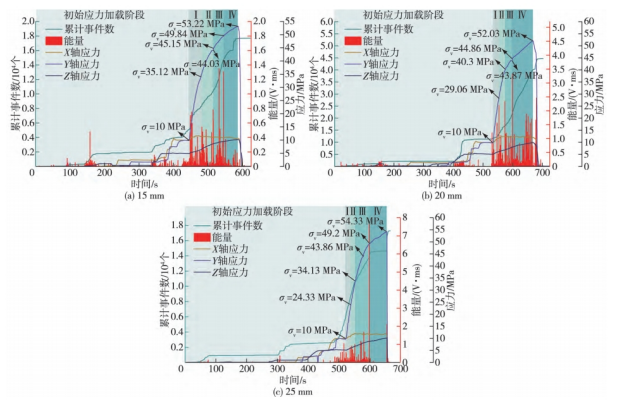 声发射累计事件数、能量和应力随时间变化曲线