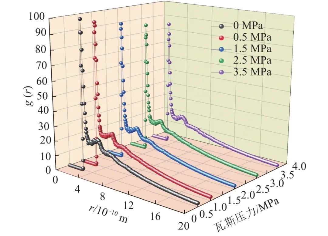 13C-NMR谱图的桥碳比一致;瓦斯氛围下煤水微观润湿体系中,煤水交界面以下,水分子的相对浓度随着瓦斯压力的增大而减小;煤水交界面以上,瓦斯压力越大,水分子相对浓度峰值越大;瓦斯氛围下煤水微观润湿体系中,随着瓦斯压力的增加,水分子的吸附程度减弱,煤中瓦斯被置换的程度减小,甲烷分子的扩散系数减小,水分子分散程度增加,聚集程度减弱,水分子的扩散系数增加。