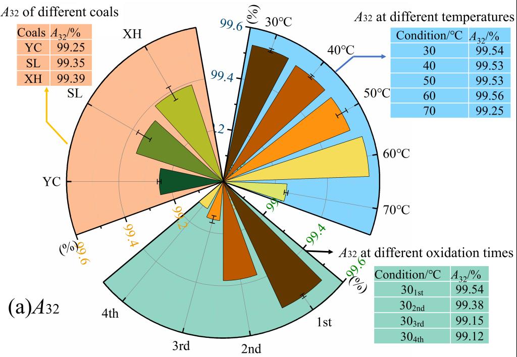 (3)羧基是氧化生成CO2的主要活性物质。不同条件下氧化CO2的A32均大于99%,在氧化过程中,99 %以上的CO2是由煤中原有的羧基产生。