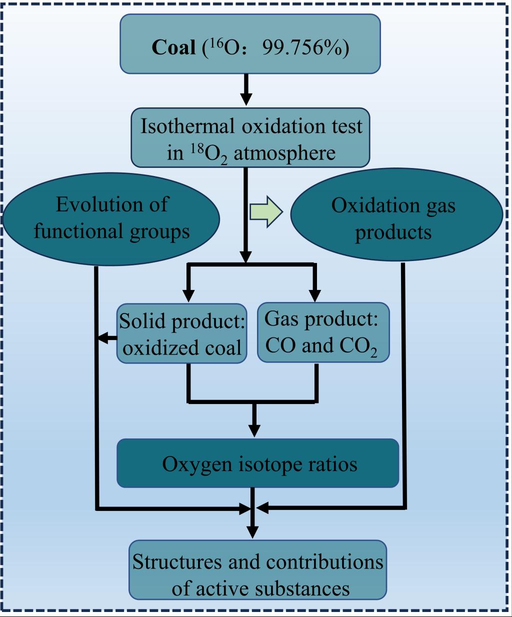 采用氧同位素示踪法测定引发煤自燃活性物质的结构和贡献。在人为改变氧同位素比值后,煤样在18O2气氛下,进行了不同温度、不同氧化次数以及不同煤样的等温氧化。首先,通过循环氧化实验得到了煤的氧化产气特性,提供了气体同位素试验的基本参数。然后使用同位素比质谱仪测试被18O标记的氧化产物,分析煤中的原始活性物质的结构及贡献。最后,使用XPS测定了煤中官能团的演化,分析了活性物质的转化途径。结果表明,在氧化过程中,70%以上的CO是由煤中原有的羟基和醛生成的,99%以上的CO2是由煤中原有的羧基生成的。抑制羟基、醛、羧基的氧化分解可以有效控制煤自燃,解决低阶煤氧化引起的CO溢出问题。